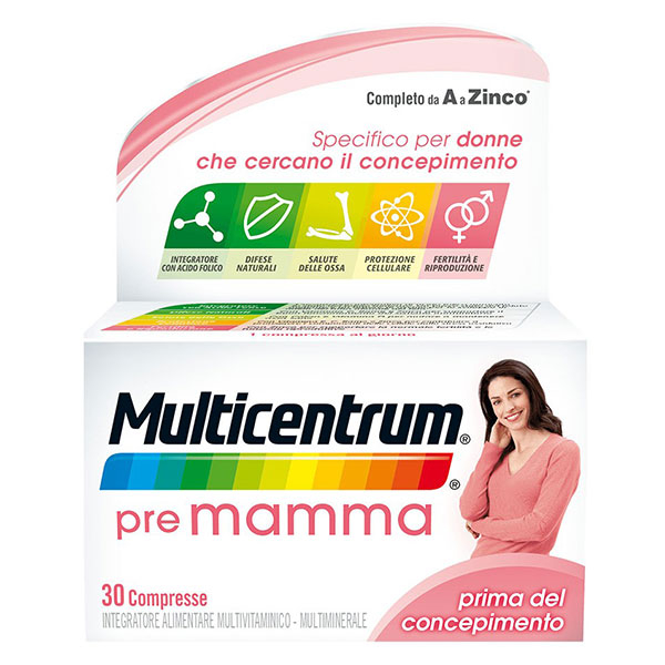 L’integratore alimentare Multicentrum Pre Mamma è un prodotto specifico per le donne che stanno programmando o desiderano una gravidanza. Questo preparato deve essere assunto nel periodo precedente al concepimento perché contiene Acido Folico, fondamentale per il corretto sviluppo del feto e del suo sistema nervoso, minerali e vitamine come Vitamina C, D e E, Rame, Zinco e Calcio che contrastano lo stress ossidativo e rappresentano un valido aiuto a supporto delle funzioni riproduttive, della fertilità e della salute delle ossa. Multicentrum Pre Mamma può essere assunto per periodi di tempo prolungati e non contiene glutine né zuccheri